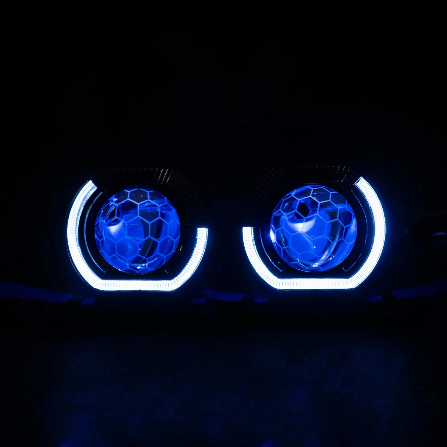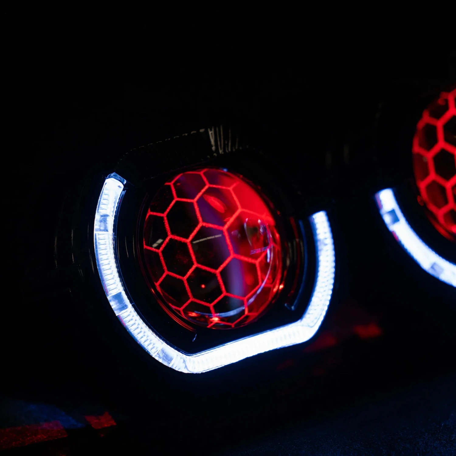This Angry Eye Kit is available in a Gloss Black finish and offers a White Daytime Running Light (DRL) & Amber indicators. They are also packed with a Colour Changing Demon Eye (inner) which can be controlled via Bluetooth.