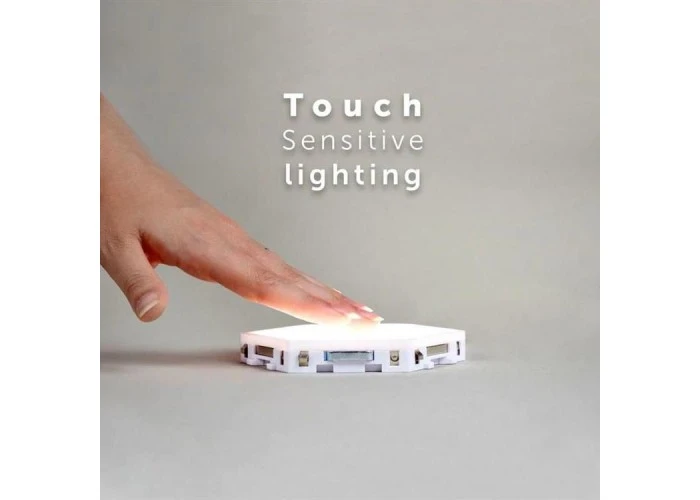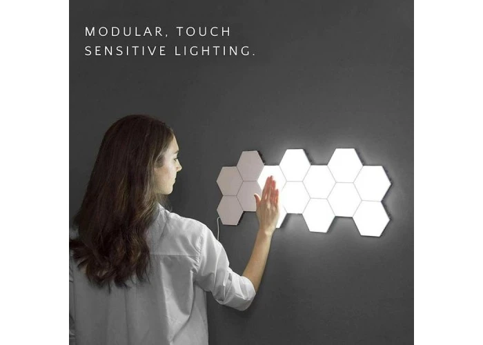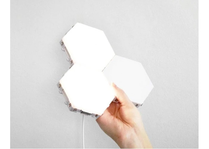 This product consists of multiple plastic hexagons that can be connected together via magnets and interlocking patterns to form a touch screen wall light. The magnets that form the physical connection between components also allow the electricity to pass through from one piece to another.